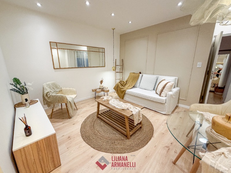 Departamento de 2 ambientes totalmente reciclado. Amplio living comedor a la calle. Cocina con barra desayunadora y amoblamiento a medida. Heladera. Lavarropas. Dormitorio a la calle con placard. Amplio lugar de guardado. Baño completo con mampara. Muebles a estrenar. 50 mts. Ubicado en Santiago del Estero y San Martin.