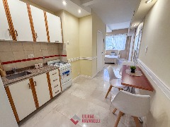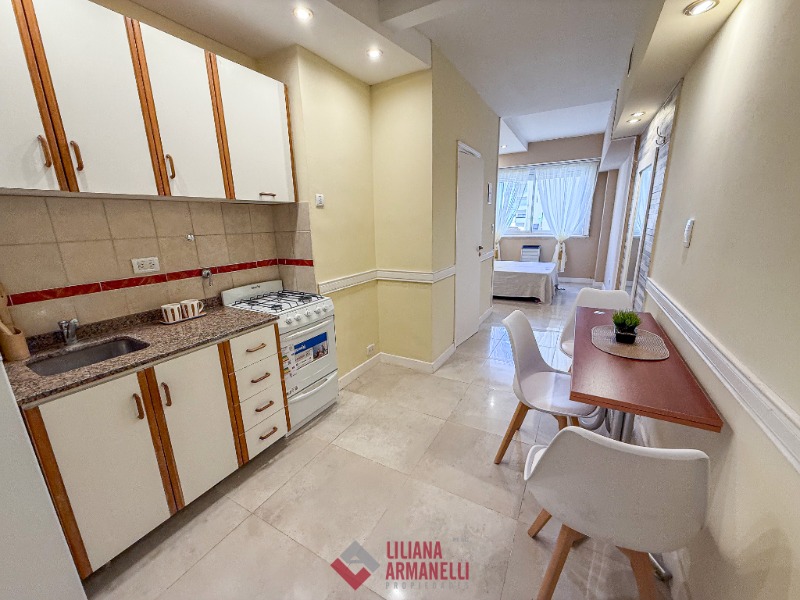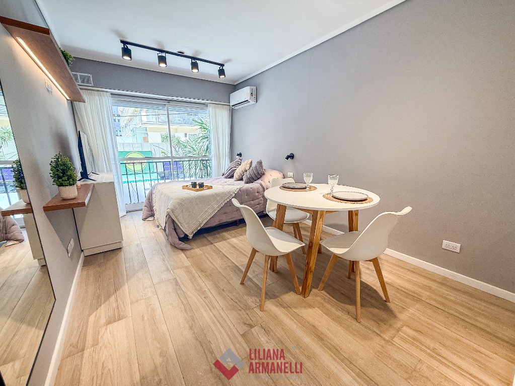 Departamento de 1 ambiente totalmente reciclado. Amplio. A la calle con balcón francés. Cocina con barra desayunadora. Baño completo. Aire acondicionado. Muebles a estrenar. 26 mts. Ubicado en Entre Ríos y Colón.