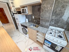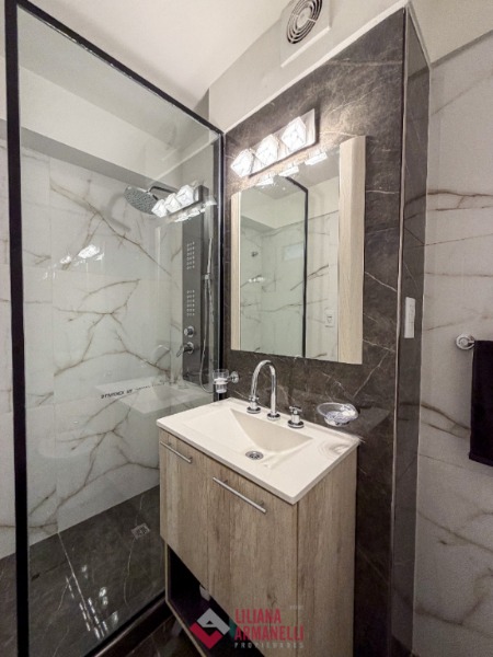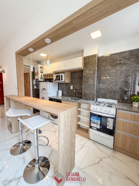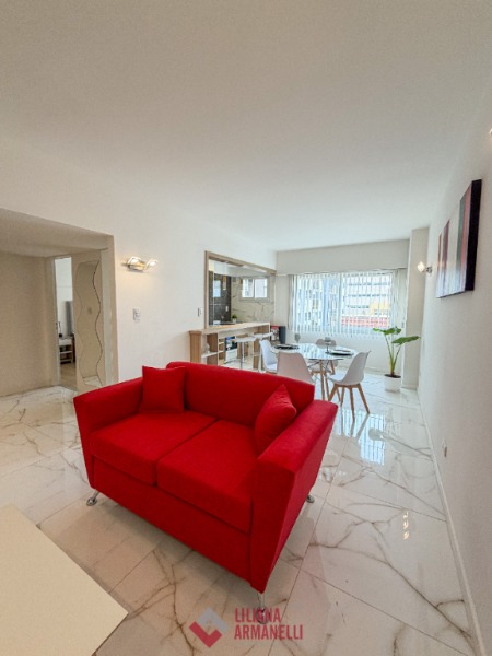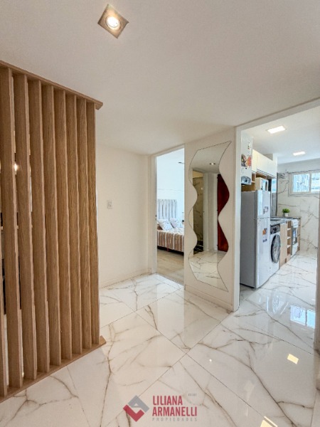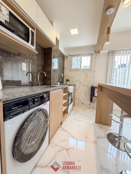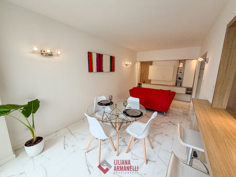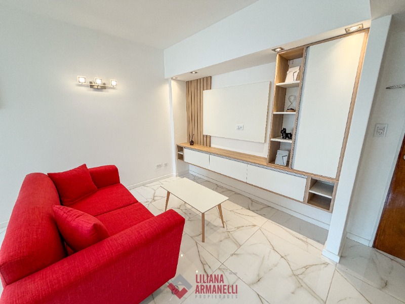 Departamento de 2 ambientes totalmente reciclado. Amplio living comedor. Cocina separada por barra desayunadora con amoblamiento a medida. Heladera. Lavarropas. Dormitorio con placard. Baño completo con mampara. Muebles a estrenar. Placard empotrado en pasillo. 47.51 mts. Ubicado en Santiago del Estero y San Martín.