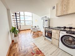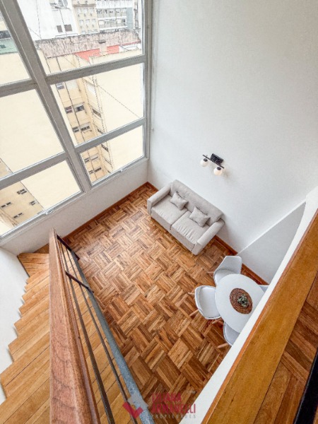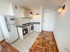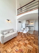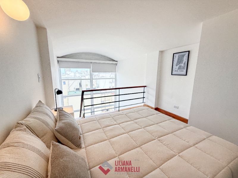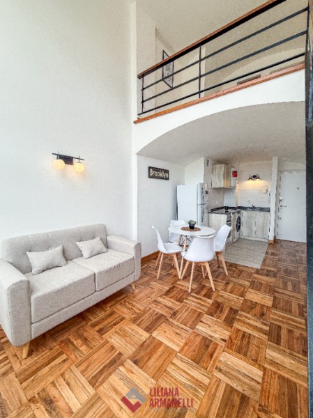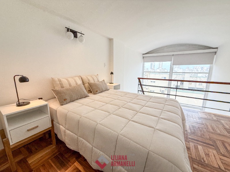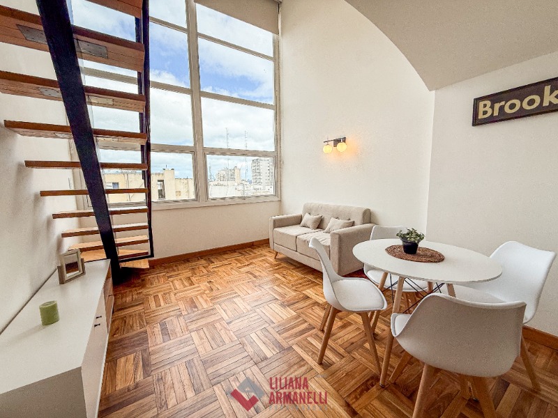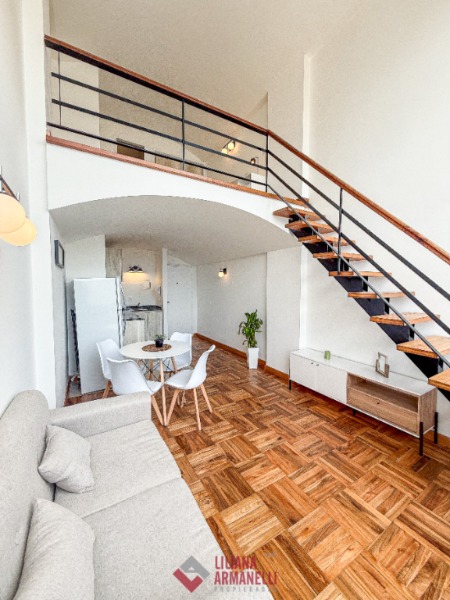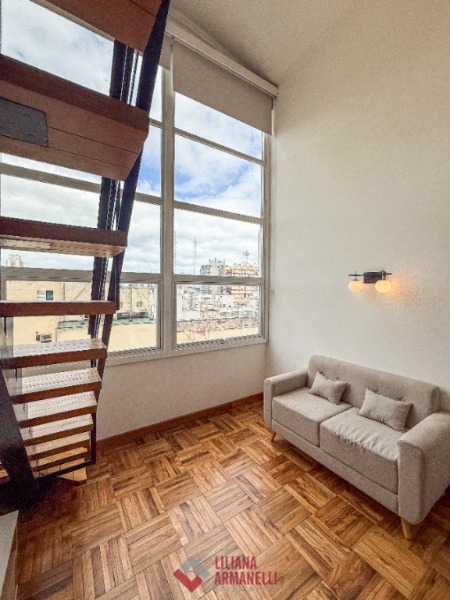 Departamento en dúplex. Amplio living comedor con piso de parquet. Cocina integrada. Gran ventanal. Dormitorio en planta alta con placard. Baño completo. Muebles a estrenar. 36 mts. Ubicado en San Luis y Rivadavia.