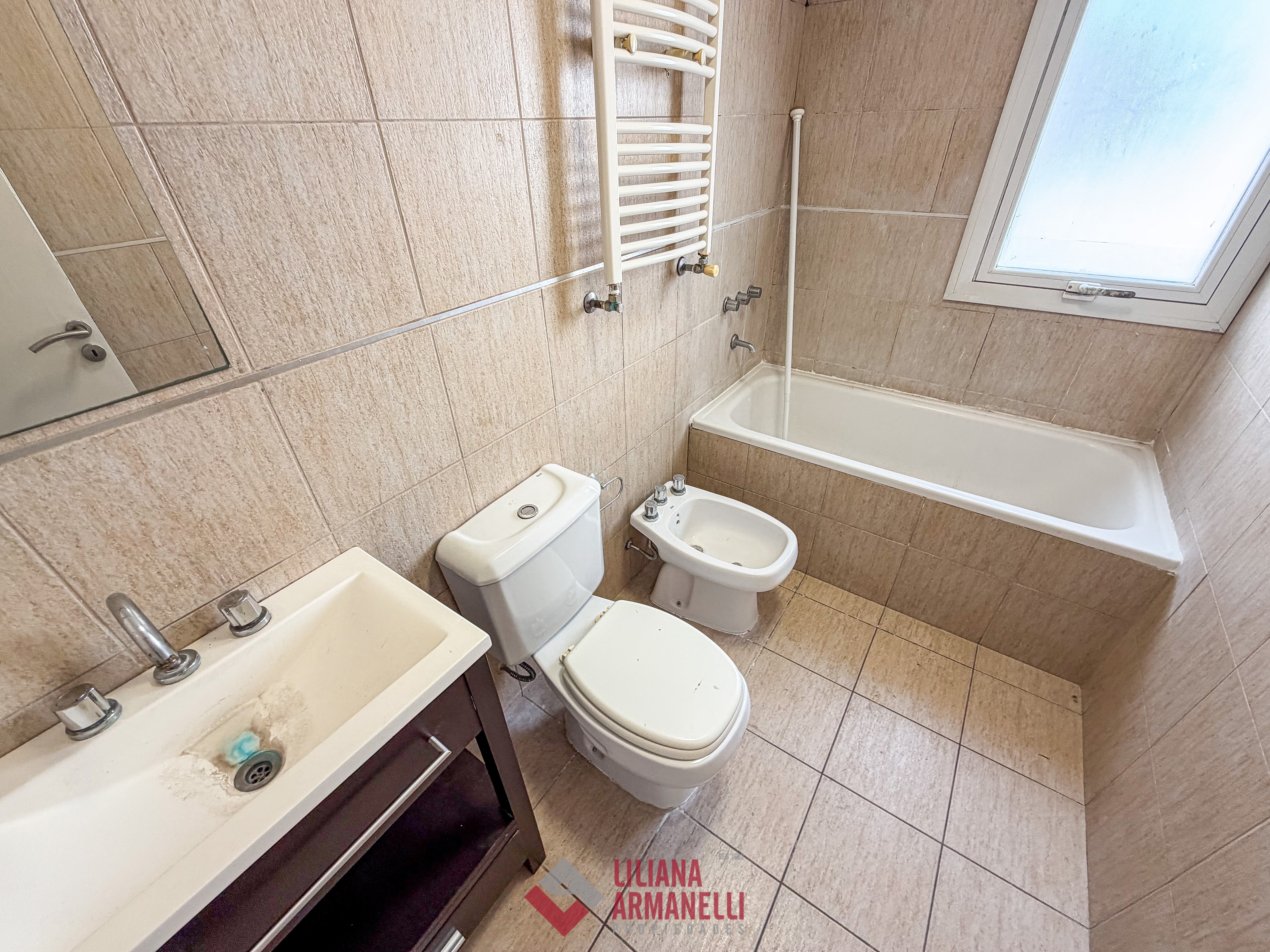 Departamento de 3 ambientes. Amplio living comedor. Balcón saliente. Cocina separada con amoblamiento a medida. 2 Dormitorios con placares. Baño completo con bañera. Calefacción por radiadores. 62 mts. Cochera. Apto crédito. San Juan.